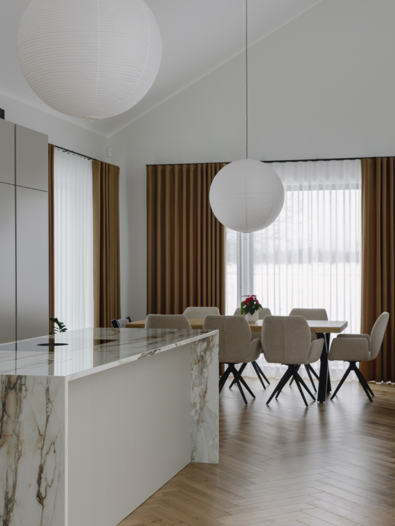 Esimeses tiivas paikneb avatud planeeringuga elutuba ja köök, mis moodustavad maja sotsiaalse keskme.