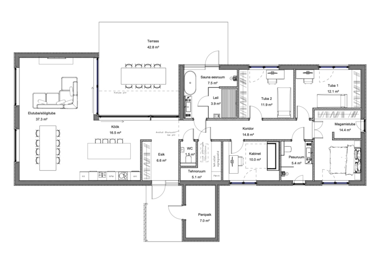 Teises tiivas asuvad neli magamistuba koos kahe vannitoaga, millest üks sisaldab ka leiliruumi – privaatne ja rahulik tsoon, mis on selgelt eraldatud maja aktiivsemast osast.
