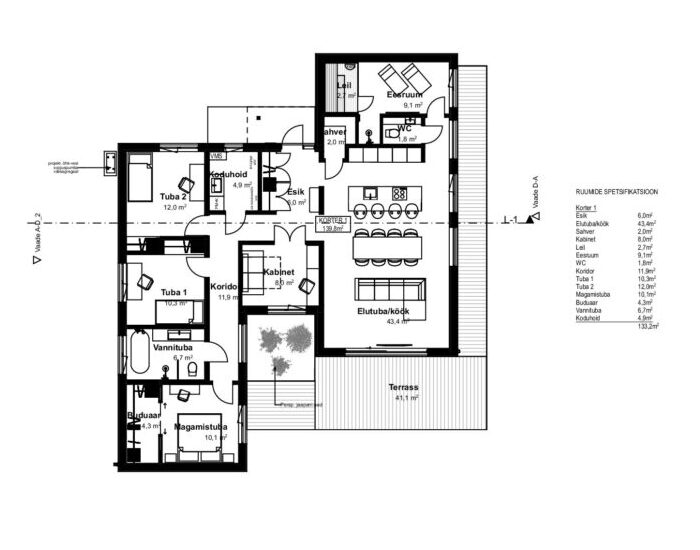 U-kujulise plaanilahenduse eriliseks elemendiks on läbi maja vaadeldav, haljastatud ja valgustatud sisehoov, mis toimib nii visuaalse keskpunkti kui ka rahuliku väliruumina, tuues looduse igapäevaselt eluruumidesse.